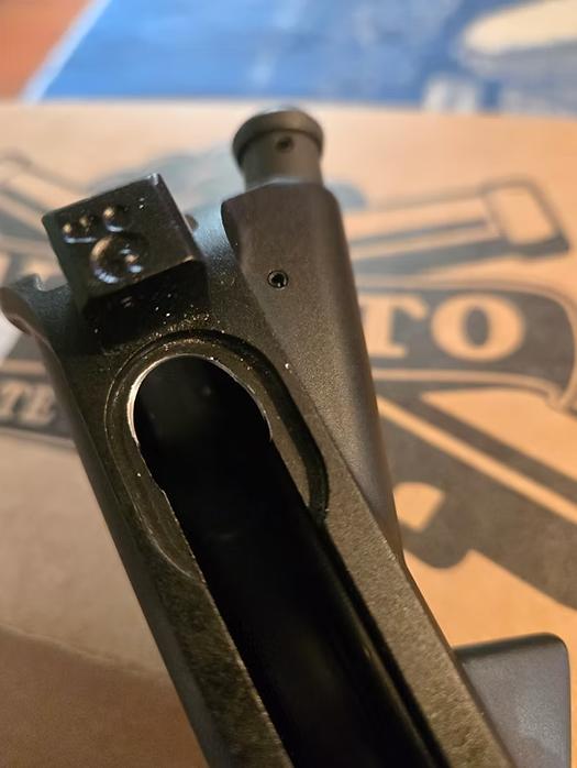 When assembled, if the BCG gets stuck when pulled to the rear, this id usually a clearance issue between the lever, BCG, and upper. First, verify the lower is not a high shelf lower (we have a list on our FAQ, but always double check your own part). If it is a low shelf lower, you can sand down or cut the rear of the upper opening back. WE RECCOMEND A SANDING DRUM ON A DREMEL TOOL (see below)